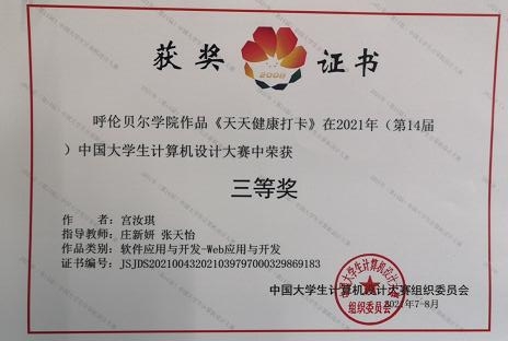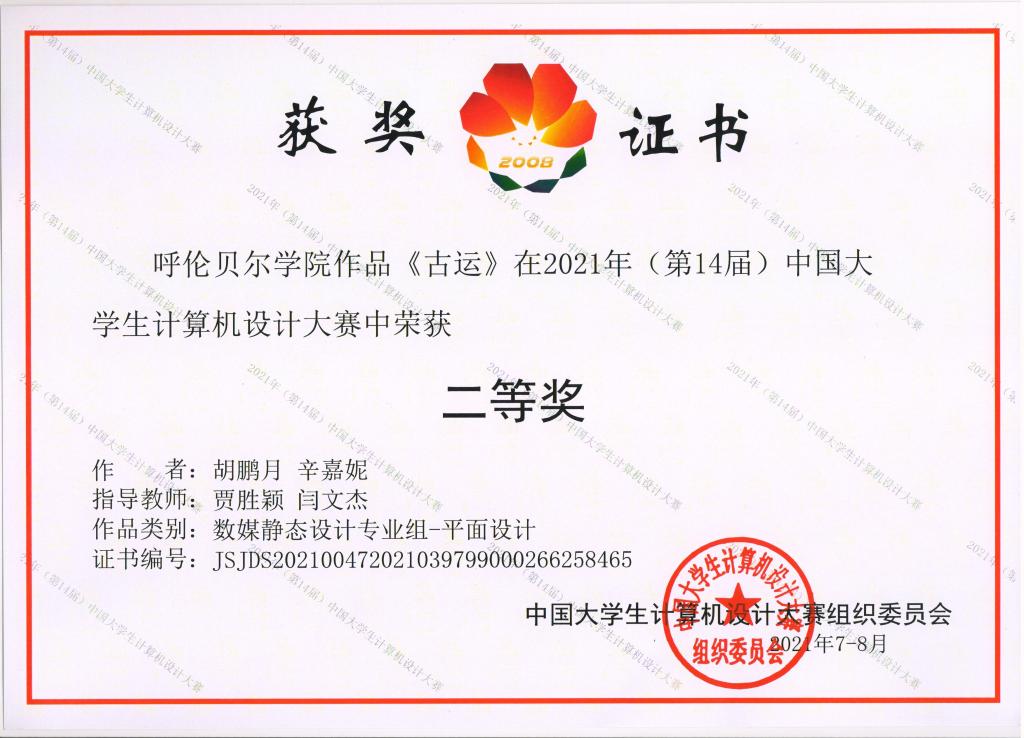 “中国大学生计算机设计大赛”由教育部高等学校计算机类专业教学指导委员会主办,是我国计算机类影响力最大、参与面最广的创新创业竞赛之一。本届大赛经过层层选拔从全国800多所高校提交的10万余件作品中最终评出2653件优秀作品,其中来自传媒学院数字媒体技术系卓立平面动画工作室的胡鹏月、辛嘉妮创作的平面设计《古运》(指导教师:贾胜颖、闫文杰)荣获二等奖,教育技术系的要佳欣、李亚飞、郑妍创作的微课《植物的生长变化》(指导教师:郭姣、王晓莉)和刁云杰、韩城桐、孟红旭创作的微课《蜕变——蝴蝶》(指导教师:甘甜、于丹)荣获三等奖。来自计算机学院软件工程系宫汝琪创作的Web应用系统《天天健康打卡》(指导教师:庄新妍、张天怡)和网络工程系贾雪恩创作的《基于碳纤维材料制作的智能温控透气保暖服》(指导教师:刘仁山)荣获三等奖。