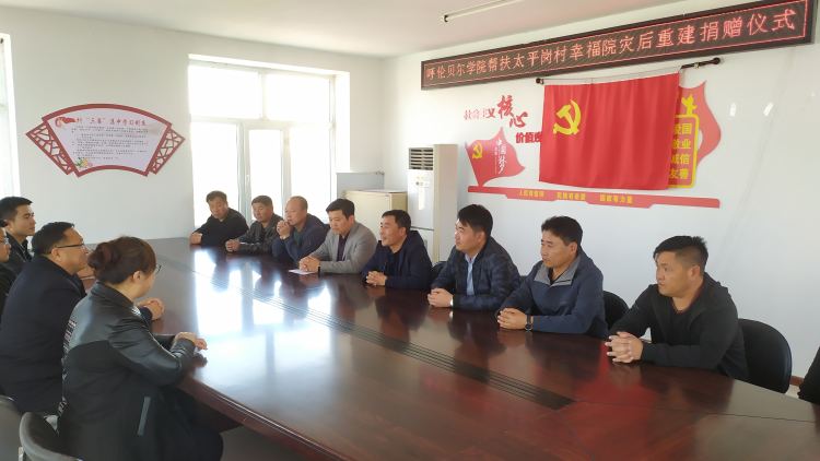 10月9日,校党委副书记张国栋一行深入到阿荣旗兴安镇太平岗村幸福小院为五户失火重建住户送去了38000元的资金和价值5900元的物资,并鼓励他们在各级党委政府的帮助下,要坚定信心,乐观的面对生活,尽快走出困境,过上幸福生活。