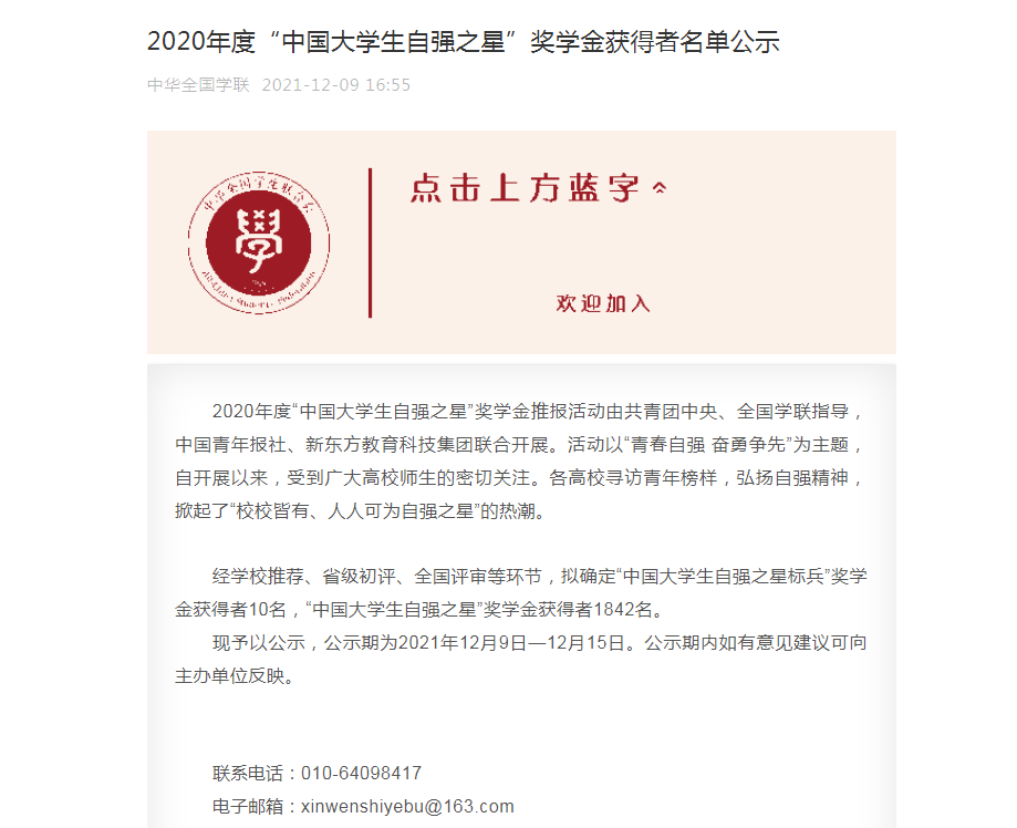 近日,由共青团中央、全国学联指导,中国青年报社、新东方教育科技集团联合开展的2020年度“中国大学生自强之星”奖学金评选活动中,世界杯官网数学与统计学院李传奇同学通过层层选拔,最终被评选为2020年度“中国大学生自强之星”荣誉称号。