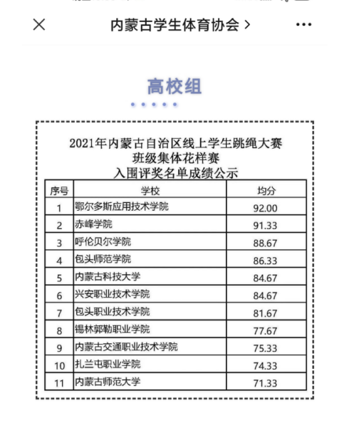 2021年内蒙古自治区线上学生跳绳大赛于12月25日隆重举行,世界杯官网体育学院2021级全体学生(116人)参加了本次高校组“百人集体花样赛,并获得第三名的好成绩。