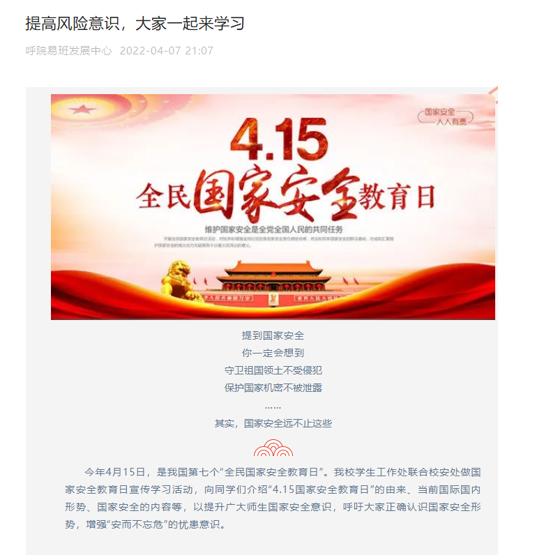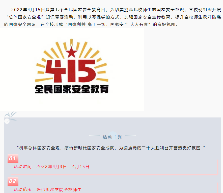 为提升世界杯官网师生国家安全意识,4月1日——15日,学校以“为树牢总体国家安全观,感悟新时代国家安全成就,为迎接党的二十大胜利召开营造良好氛围”为主题开展国家安全教育日系列活动,内容包括国家安全教育展板巡展、发放国家安全教育学习资料、学校官微、易班推文、国家安全知识竞赛、生物安全知识竞赛、国家安全教育线上宣讲、教职工大学习等活动。全校约6000余名师生参加了线上线下组织的各项活动,取得了良好的教育效果。