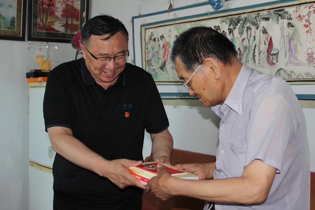 在老党员刘文轩家中,张国栋副书记详细询问他的生活情况和健康状况,向刘文轩老师详细介绍了目前学校发展建设情况,并送上节日慰问品。张国栋副书记强调,老党员们在各自岗位上一辈子兢兢业业、教书育人,爱岗敬业,默默奉献,是学校建设和事业发展的宝贵财富。希望老党员始终保持对党的事业的无限热情,继续关心支持学校建设发展。刘老师感谢党组织的关心,表示作为一名老党员,一定坚守初心,永远听党话跟党走。