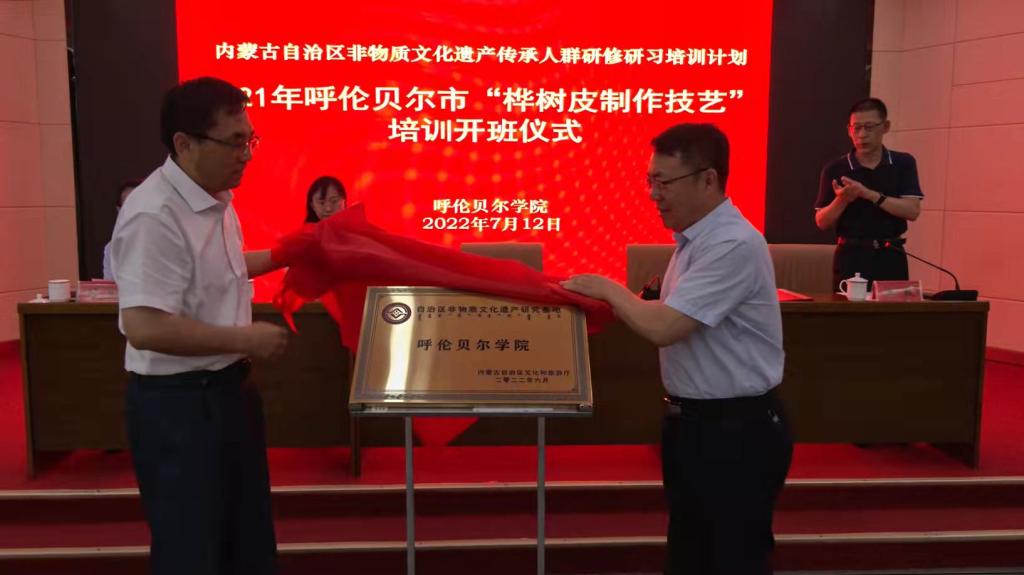 7月12日,“内蒙古自治区非物质文化遗产传承人群研修研习培训计划”——“桦树皮制作技艺”培训班开班仪式暨“自治区非物质文化遗产研究基地”揭牌仪式在世界杯官网举行。党委委员、副校长孟祥宏,呼伦贝尔市文化旅游广电局党组成员、副局长张本磊,非遗科科长潘斐,非遗保护中心副主任崔航,教育学院党总支书记付刚、院长王毅、副书记海江及各旗市区的40名学员参加开班仪式。