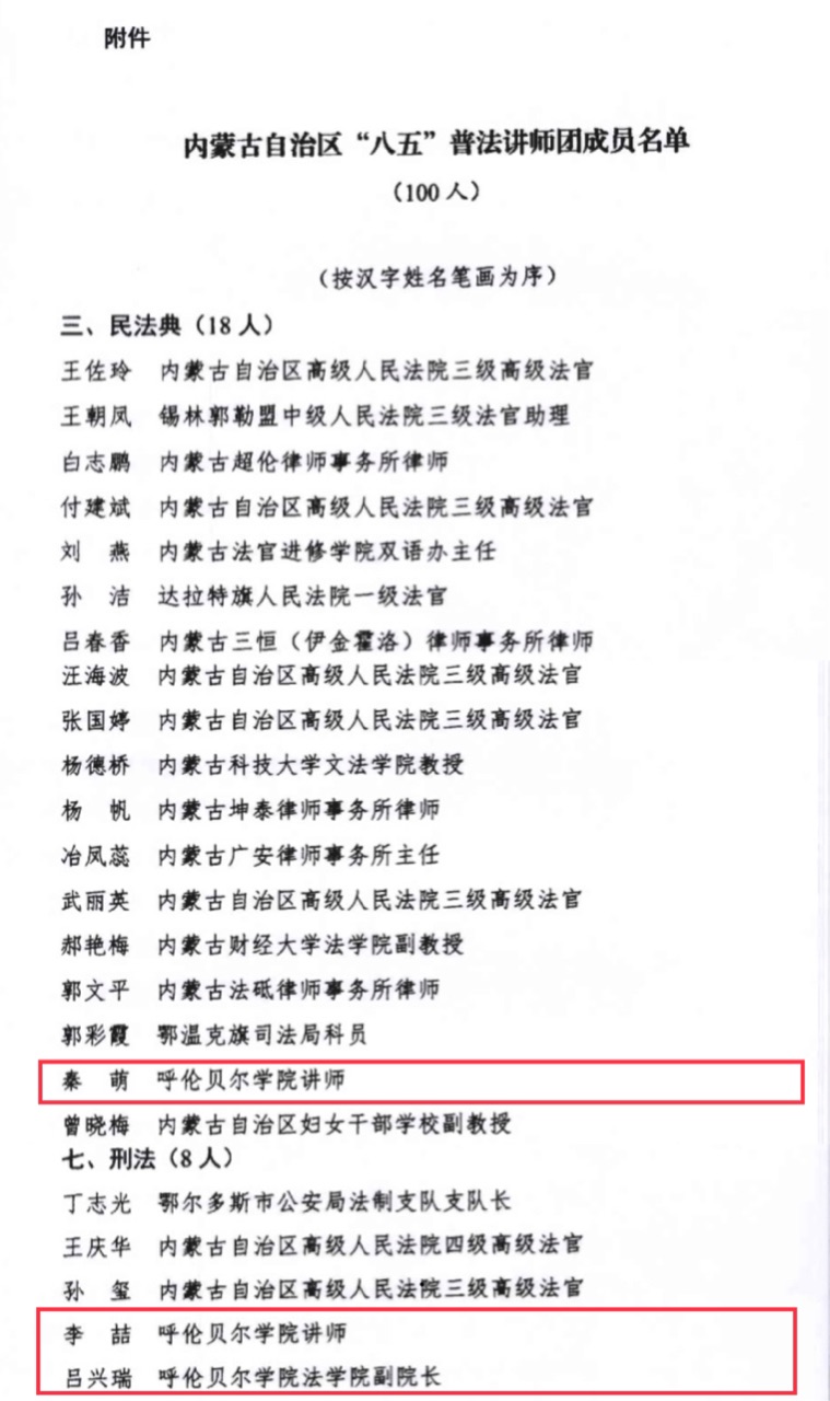 近日,内蒙古自治区委员会宣传部、内蒙古自治区司法厅下发关于成立内蒙古自治区“八五”普法讲师团的通知,世界杯官网法学院副院长吕兴瑞、讲师秦萌、讲师李喆成功入选。