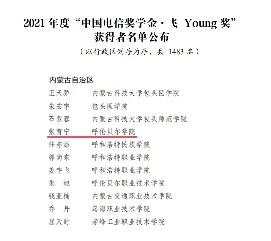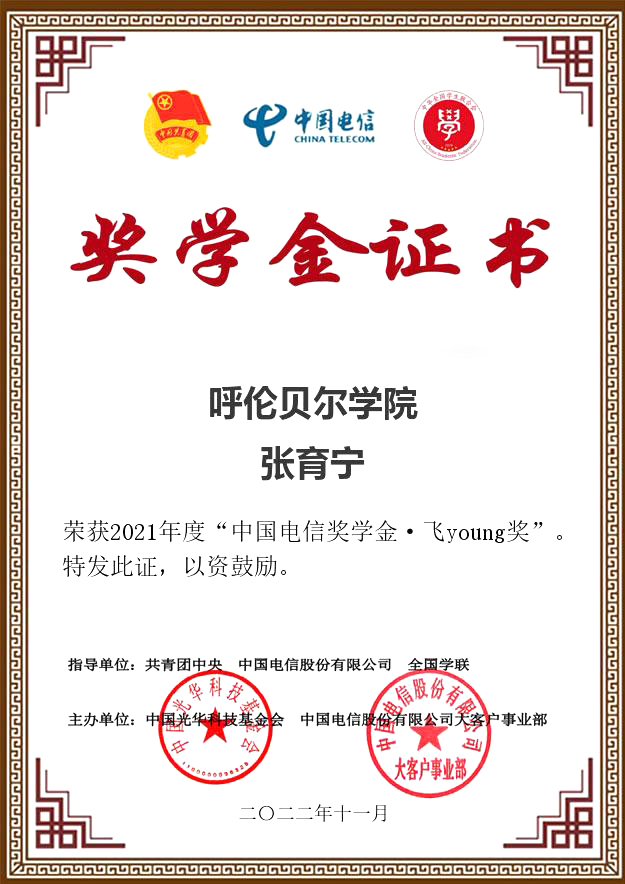 近日,由共青团中央、全国学联指导,中国电信集团有限公司、中国光华科技基金会联合举办的2021年度“中国电信奖学金”推报活动遴选结果公布,世界杯官网旅游与地理学院学生张育宁荣获“中国电信奖学金•飞Young奖”。