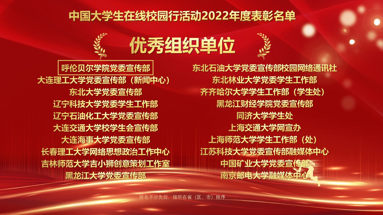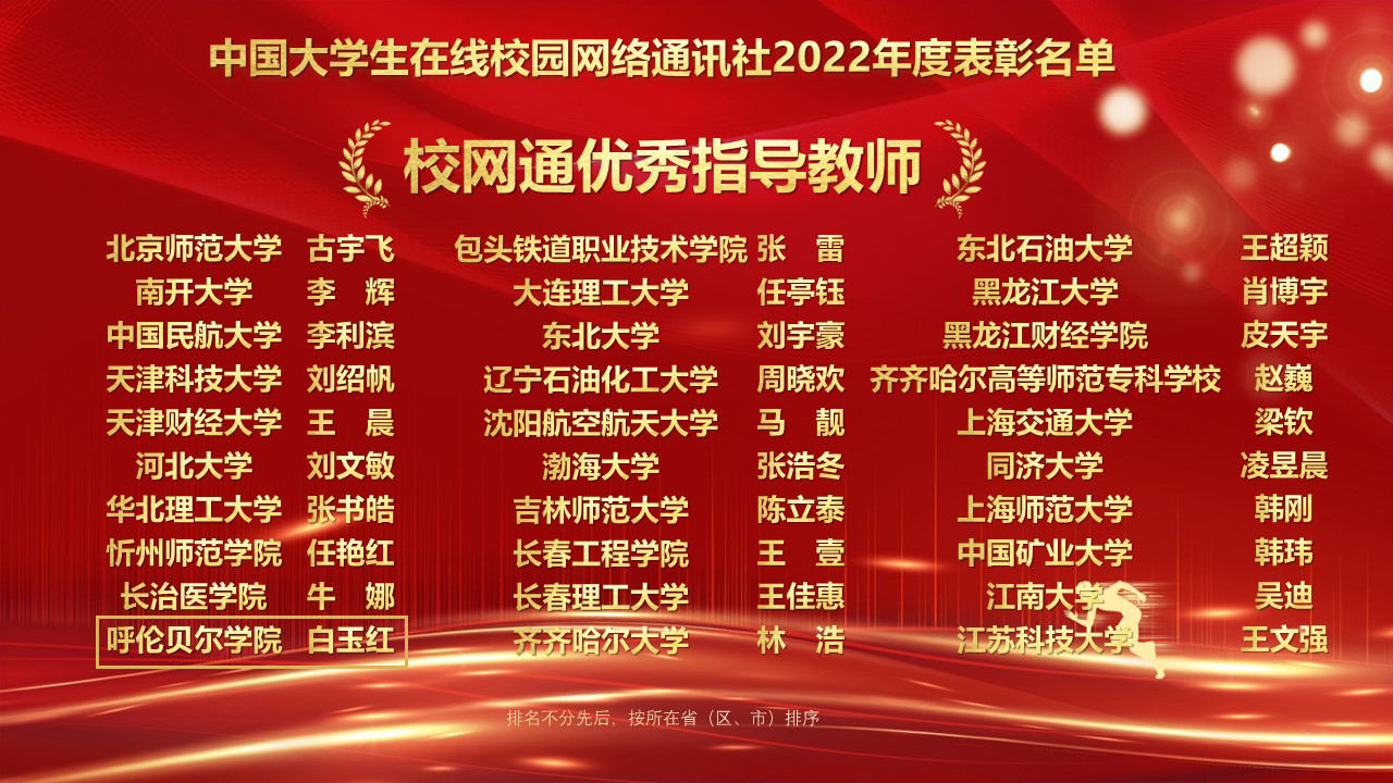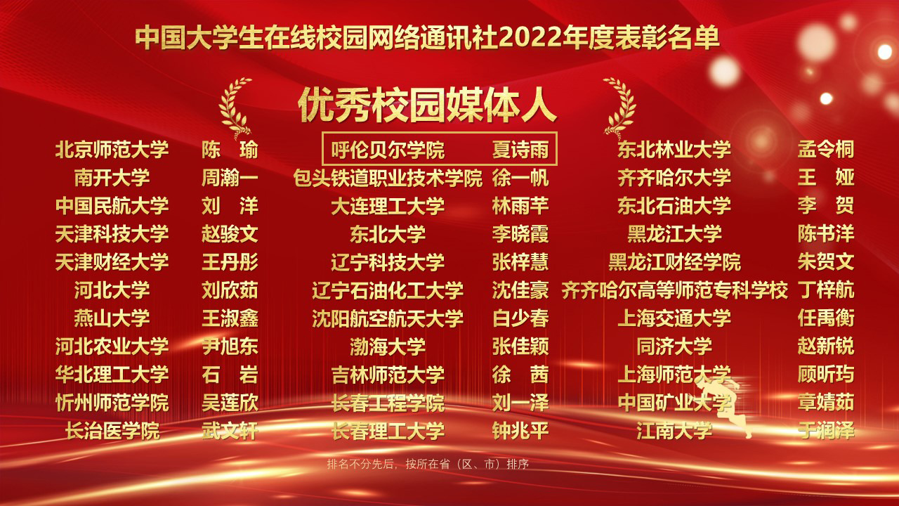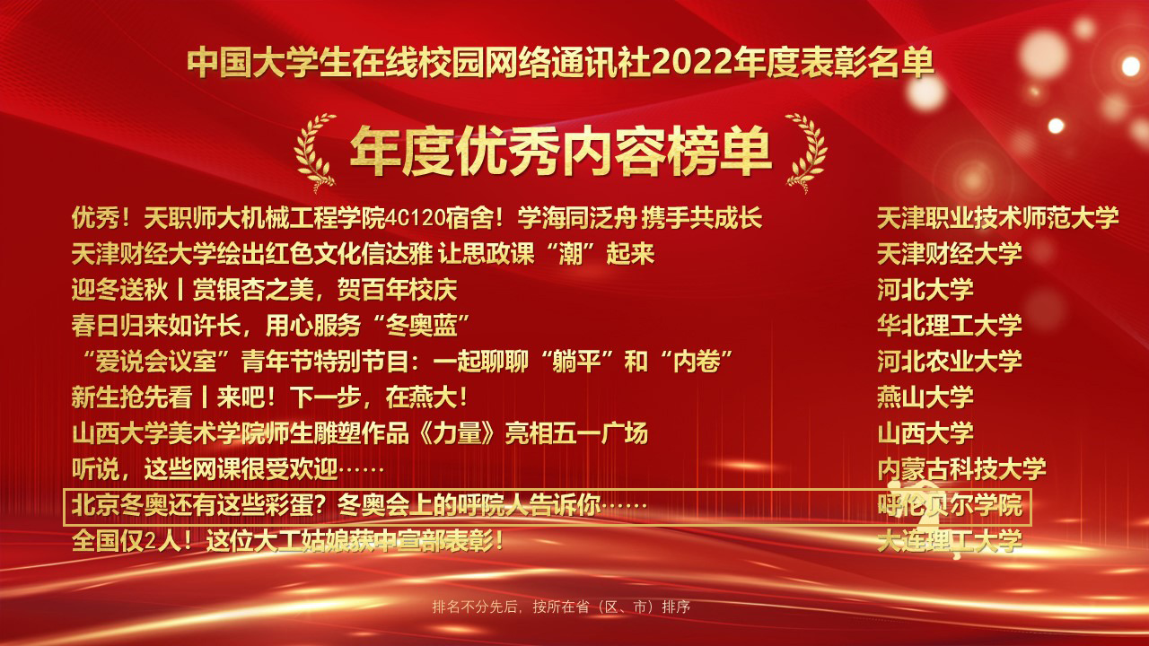 此次表彰中,美加墨世界杯官网校网通站荣获“优秀校网通站”,党委宣传部荣获“校园行活动优秀组织单位”,文章《北京冬奥还有这些彩蛋?冬奥会上的呼院人告诉你……》获得“年度优秀内容榜单”,党委宣传部宣传文化科科长白玉红荣获“校网通优秀指导教师”,大学生记者团团长夏诗雨同学荣获“优秀校园媒体人”。
