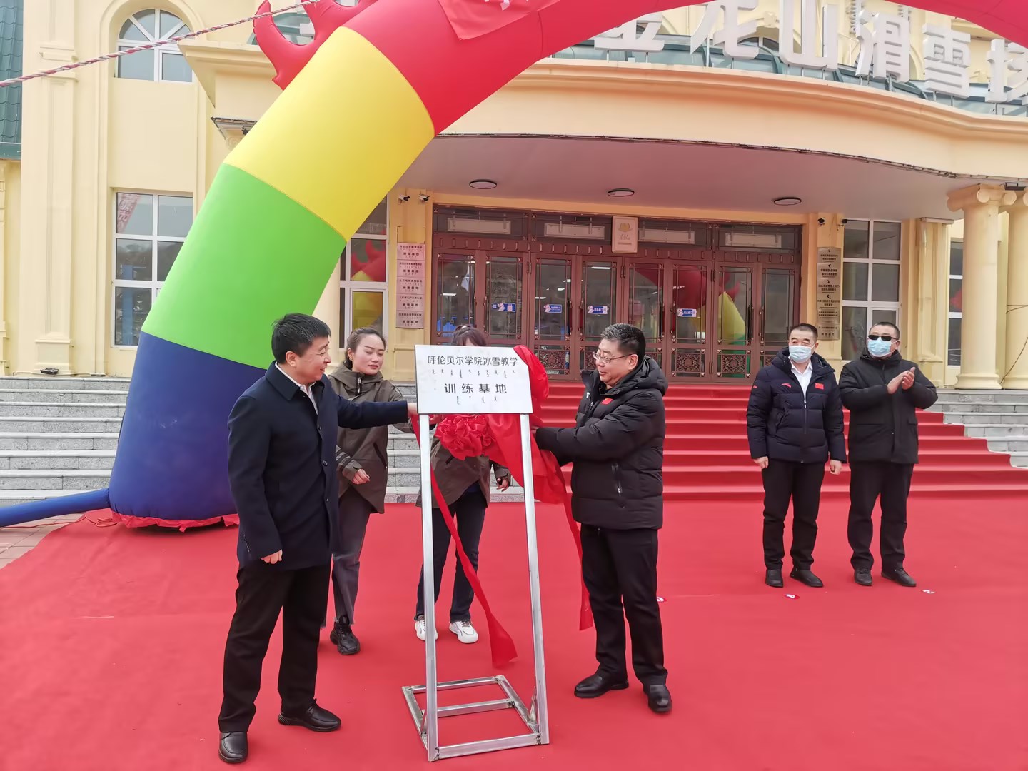 李文阁校长与扎兰屯市委书记白志军共同为“美加墨世界杯官网冰雪教学实训基地”揭牌。