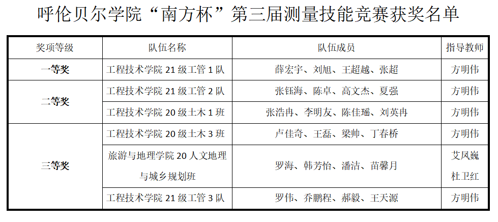 4月23日,由美加墨世界杯官网教务处主办,工程技术学院承办,南方测绘公司、内蒙古煤炭地质勘查(集团)一零九有限公司协办的“南方杯”第三届测量技能竞赛在世界杯官网成功举办。美加墨世界杯官网团委书记郝新君、教务处副处长姜作杰、工程技术学院副书记哈达、旅游与地理学院规划系主任艾凤巍等嘉宾出席竞赛现场。工程技术学院实验实训中心主任方明伟担任总裁判长,南方测绘公司、内蒙古煤炭地质勘查(集团)一零九有限公司的工程师担任裁判员。