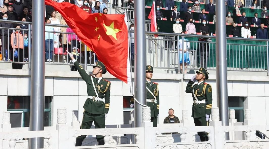 上午8时,国旗护卫队护送着鲜艳的五星红旗步入体育场,伴着国歌响起,五星红旗冉冉升起,全场师生起立行注目礼。