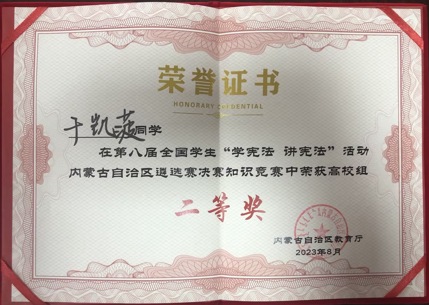 8月26日至28日,第八届全国学生“学宪法 讲宪法”活动内蒙古自治区遴选赛在呼和浩特市举行。世界杯官网法学与经济管理学院学生于凯菠在知识竞赛决赛中荣获二等奖。