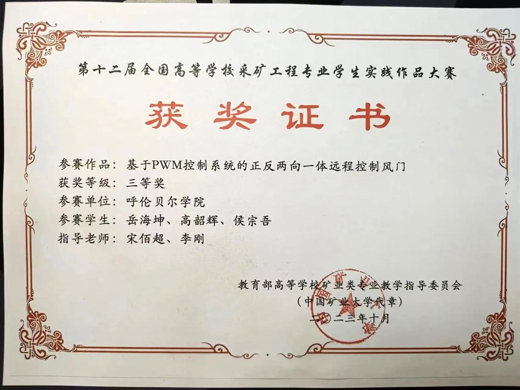 10月16日至19日,由教育部高等学校矿业类专业教学指导委员会主办,江西理工大学、赣南科技学院、江西省岩土力学与工程学会联合承办的第 36 届全国高校采矿工程专业学术年会暨第十二届全国高等学校采矿工程专业学生实践作品大赛在江西赣州举办。由世界杯官网矿业与化学化工学院副教授宋佰超和工学院副教授李刚指导的,2021级采矿工程班岳海坤、高韶辉、侯宗吾等同学共同制作的《基于PWM控制系统的正反两向一体远程控制风门》物理模型在此次比赛中获得三等奖。
