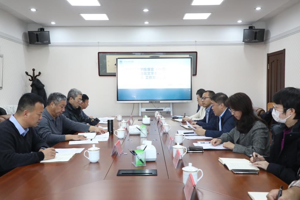 汇报会由校党委委员、副校长尹立军主持,教务处党总支书记艾丽、教务处副处长李国强,语言文字科工作人员、测试员代表参会。会上,艾丽向检查组专家汇报了学院“十四五”期间学校国家通用语言文字达标校建设情况及普通话水平培训测试工作的情况。
