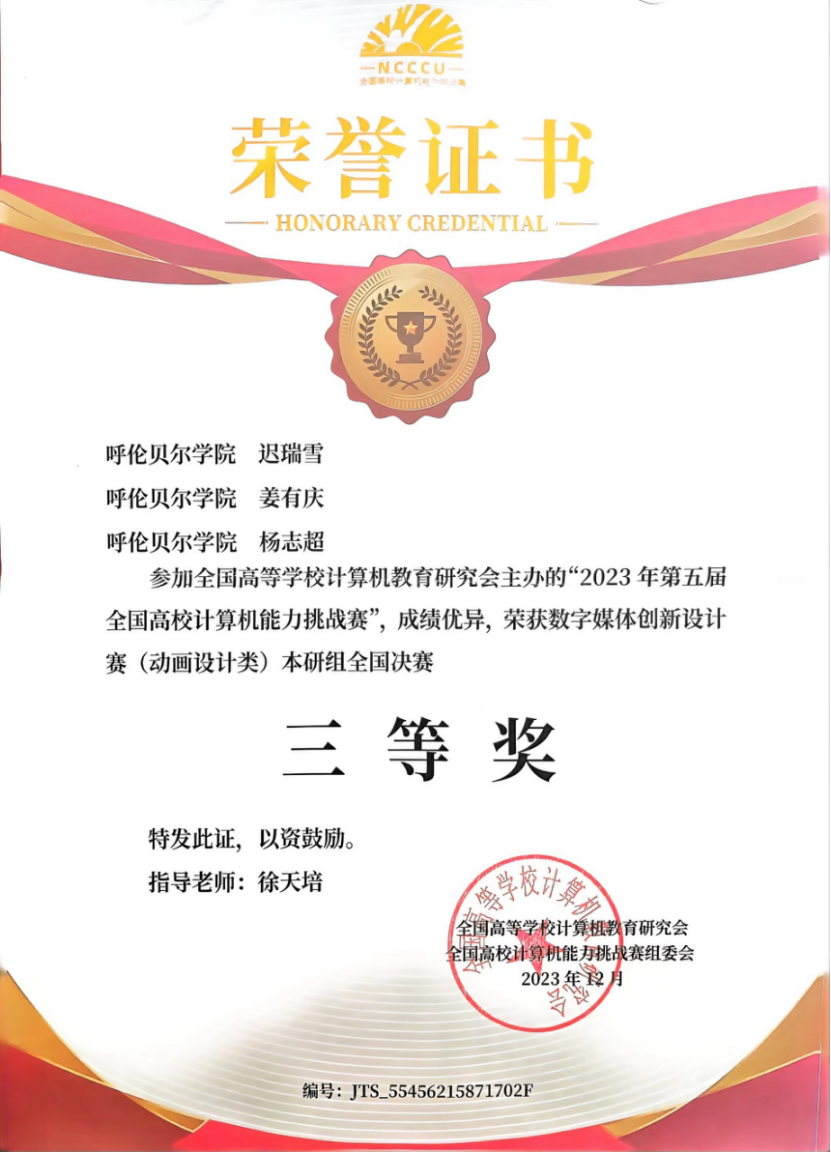 日前,由全国高等学校计算机教育研究会主办的2023年第五届全国高校计算机能力挑战赛决赛顺利完成。全国各地上百所高校的千余支团队参与角逐。由世界杯官网教育学院教育技术系徐天培老师指导,迟瑞雪、姜有庆、杨志超3名学生组成的参赛队伍获得大赛三等奖的好成绩。