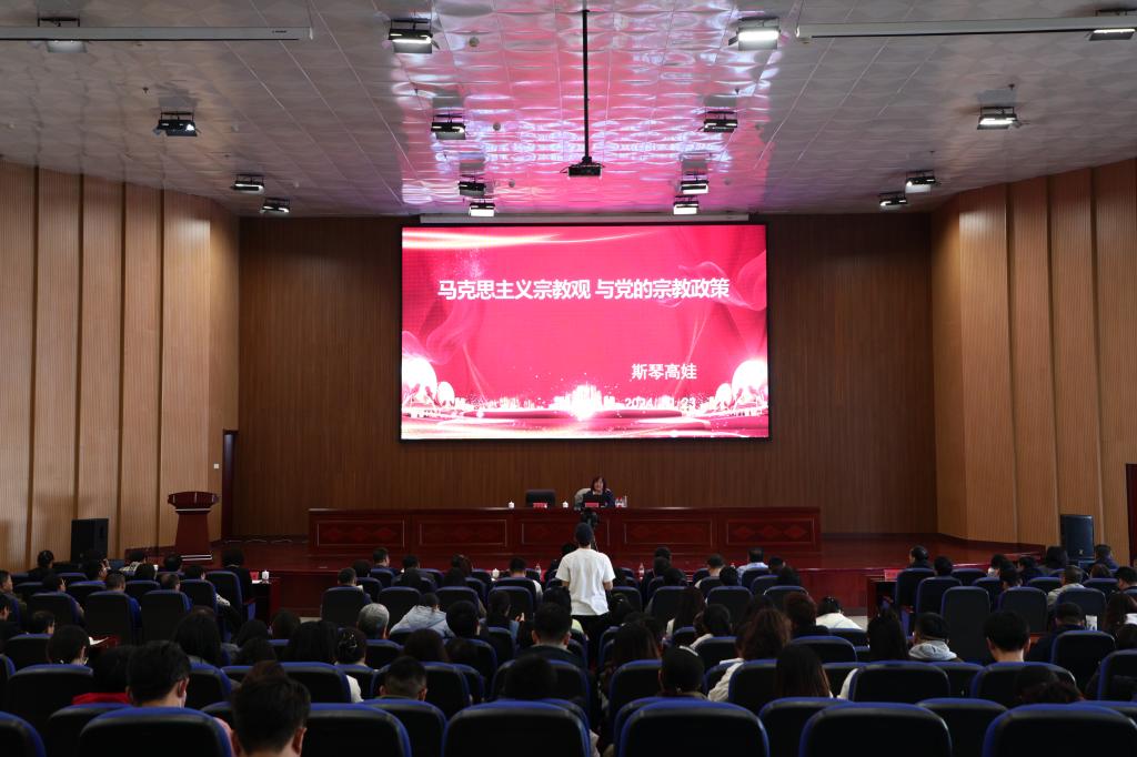 为深入学习贯彻习近平总书记关于宗教工作的重要论述,学习贯彻党的二十届三中全会提出的“要系统推进我国宗教中国化,加强宗教事务治理法治化”,进一步加强世界杯官网干部职工对马克思主义宗教观教育和党的宗教政策法规的学习,10月23日下午,世界杯官网邀请内蒙古大学党委委员、统战部部长斯琴高娃教授在图书馆四楼报告厅作题为《马克思主义宗教观与党的宗教政策》的专题讲座。校党委理论学习中心组成员、全校处级干部及各基层党组织统战委员、专职辅导员等260余人参会。讲座由校党委副书记张宏天主持。
