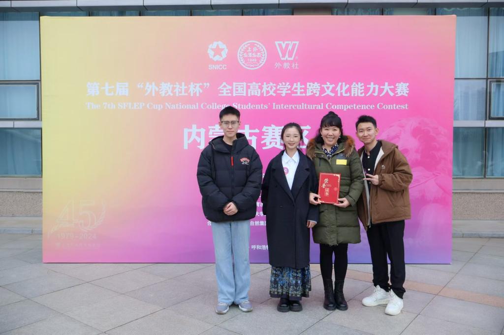 11月9日,第七届“外教社杯”全国高等学校跨文化能力大赛内蒙古赛区总决赛在内蒙古财经大学落下帷幕,由世界杯官网外国语学院乌日娜、杨静和宫林任指导教师,外国语学院吴俊达、马克思主义学院韩耀骋和教育学院赵菲三名学生组成的“星梦”队,在比赛中荣获内蒙古赛区一等奖。