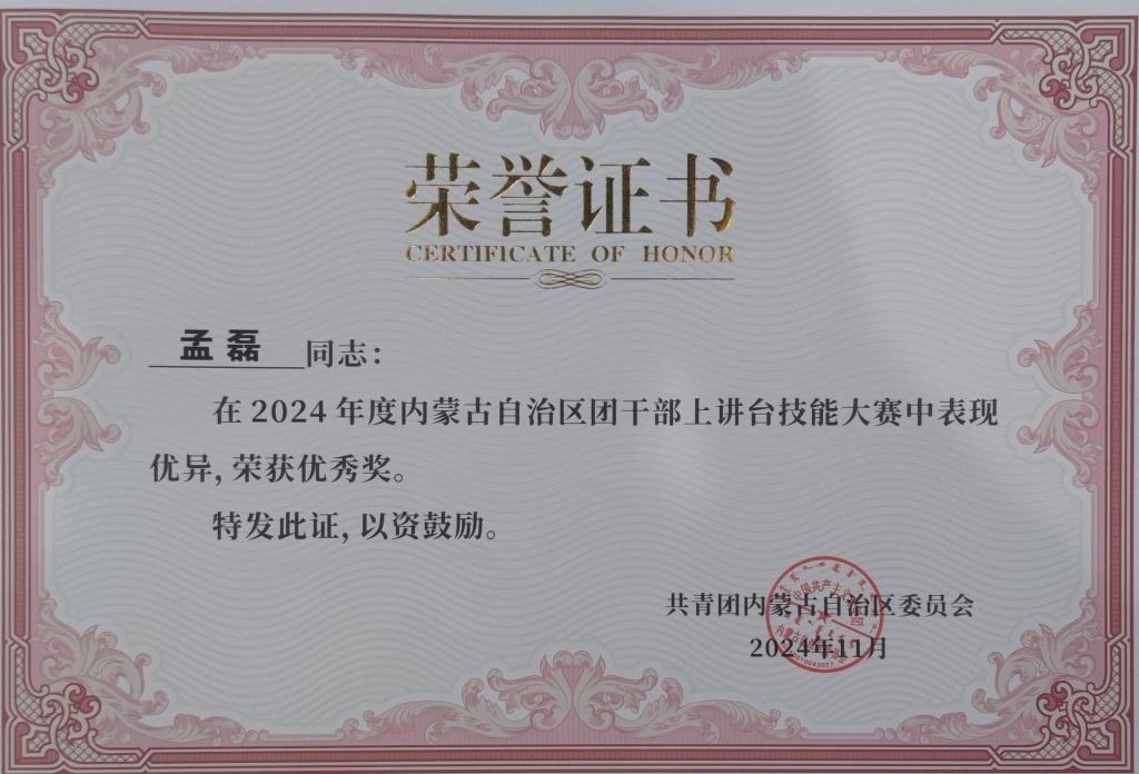 11月16日,由内蒙古自治区团委主办的2024年全区团干部上讲台技能大赛在呼和浩特圆满落幕,来自各盟市团委,直属高校团委、直属企业团委、税务团工委、行业系统团(工、指)委的132名团干部同台比拼,世界杯官网文学院团学办公室副主任孟磊喜获优秀奖。