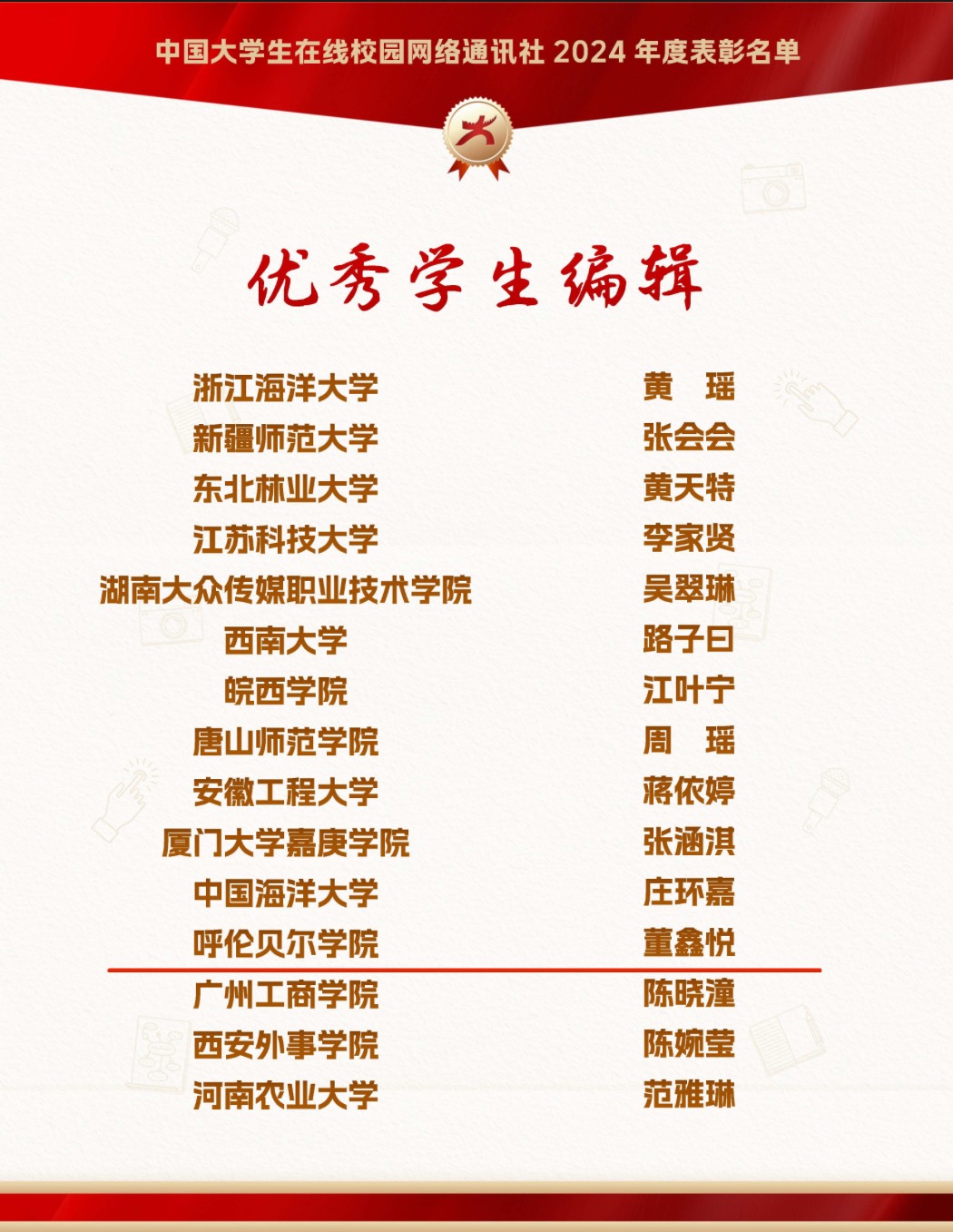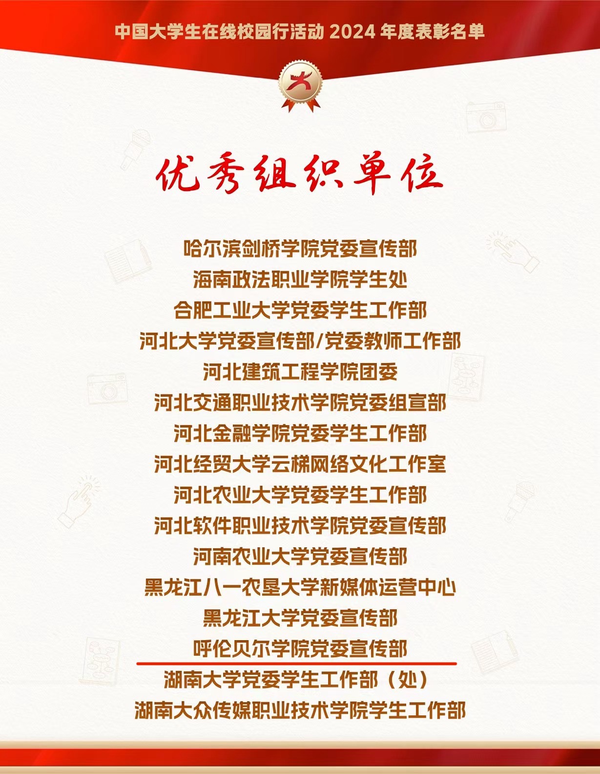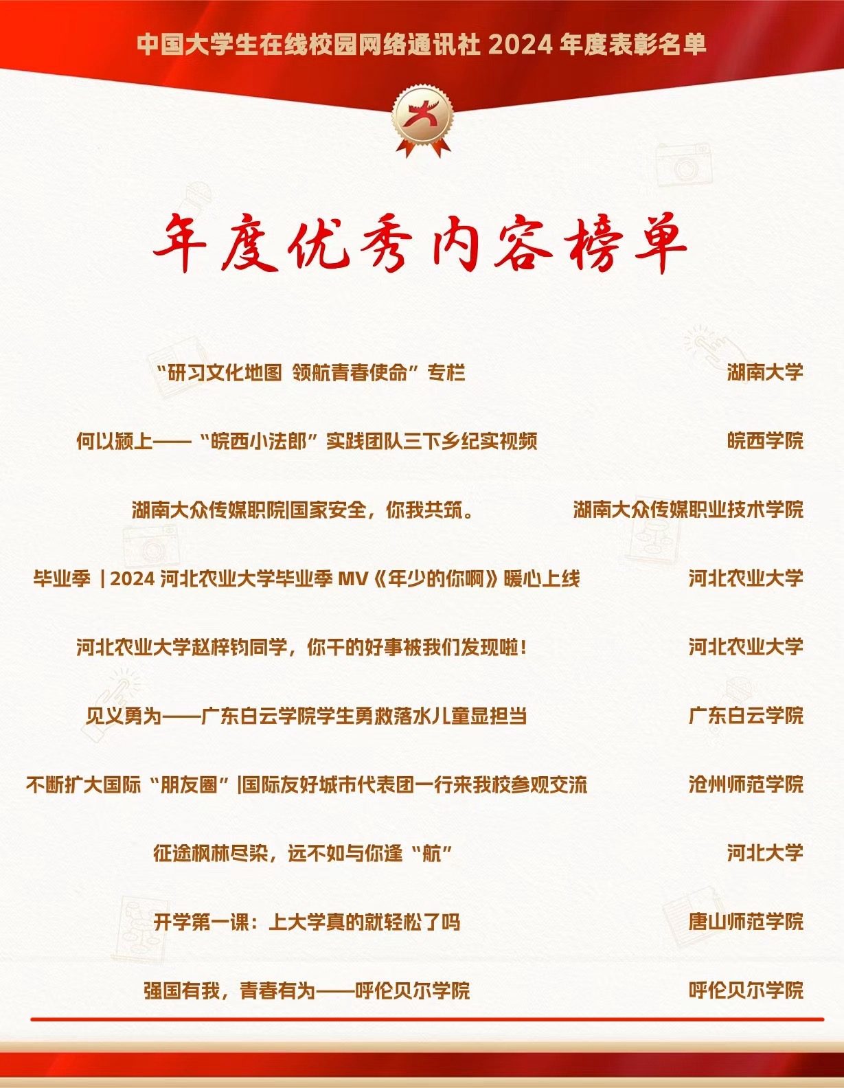 近日,教育部中国大学生在线公布了“中国大学生在线校园网络通讯社及校园行活动2024年度表彰名单”及第七届全国大学生网络文化节中国大学生在线校网通站高校入选名单,世界杯官网斩获7项荣誉。