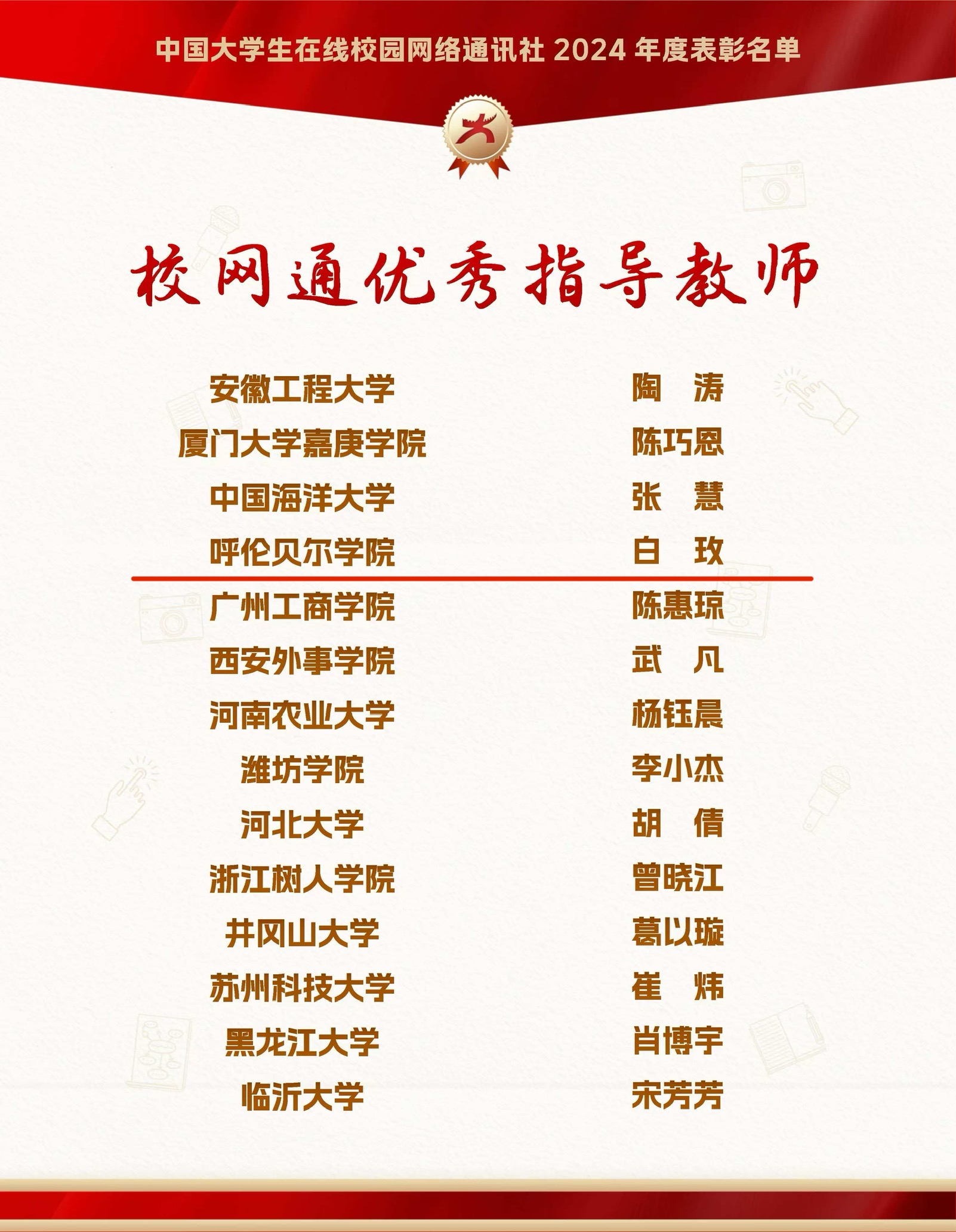 学校获评2024年度教育部中国大学生在线“优秀校网通站”,学校党委宣传部获评“校园行活动优秀组织单位”,白玫获评“校网通优秀指导教师”,崔壮获评“校园行新星指导老师”,作品《强国有我,青春有为——美加墨世界杯官网》获评“年度优秀内容”,董鑫悦获评“优秀学生编辑”,美加墨世界杯官网成功入选“第七届全国大学生网络文化节中国大学生在线校网通站高校入选名单”。自2020年6月美加墨世界杯官网入驻中国大学生在线“校园号”平台以来,已连续4年荣获22项荣誉。