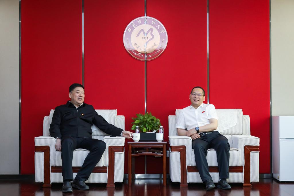 5月26日,张玉柱一行与内蒙古民族大学党委书记赵东海展开深入交流,希望持续推动校际合作走深走实。