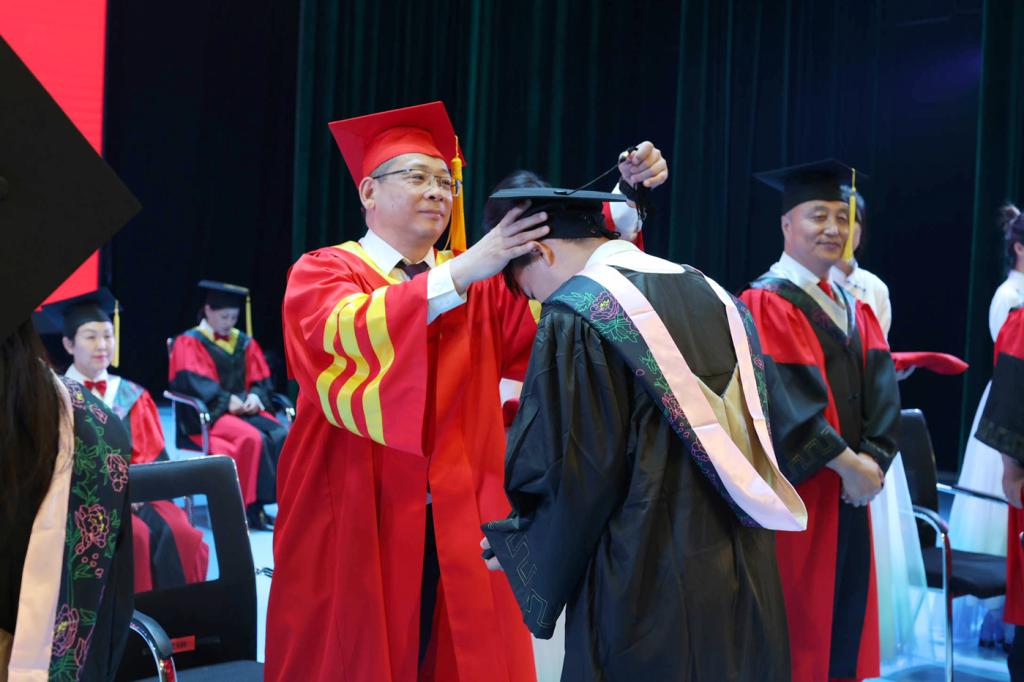 张玉柱发表了毕业致辞。他首先向顺利完成学业的毕业生们表示热烈祝贺,回顾了同学们在校期间参与的重大校园活动、取得的优异成绩。他寄语毕业生:“要坚守信念,牢记家国豪情;要脚踏实地,永葆青春激情;要宠辱不惊,常怀生活热情”,他希望毕业生们“从崇文湖畔扬帆起航,去闯荡世界、经历风雨,成为最想成为的模样,努力做一个眼有星辰大海、胸有丘壑万千、心有繁花似锦的追梦人。”校长的谆谆教诲赢得了现场阵阵热烈掌声。