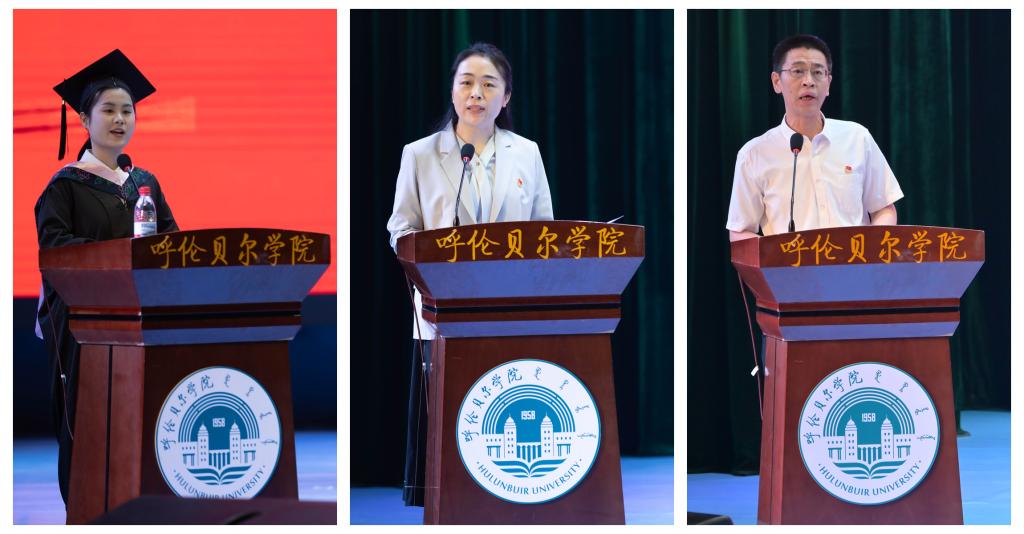 毕业生代表、教师代表和校友代表依次发言。文学院秘书学专业李嘉彤同学分享了她如何凭借探索精神追逐卓越的经历,外国语学院韩丽伟老师结合自身教学经验为毕业生送上祝福,优秀校友代表何兴涛则鼓励毕业生们继续为社会贡献力量。