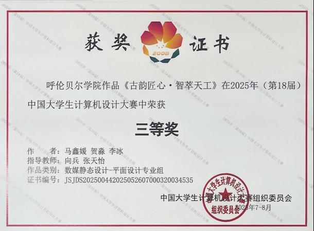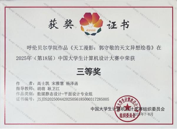 比赛中,世界杯官网参赛团队凭借扎实专业功底、独特创意及精彩现场展示突围,作品《天工漫影:郭守敬的天文异想绘卷》《古韵匠心・智萃天工》均获数媒静态设计-平面设计专业组三等奖。