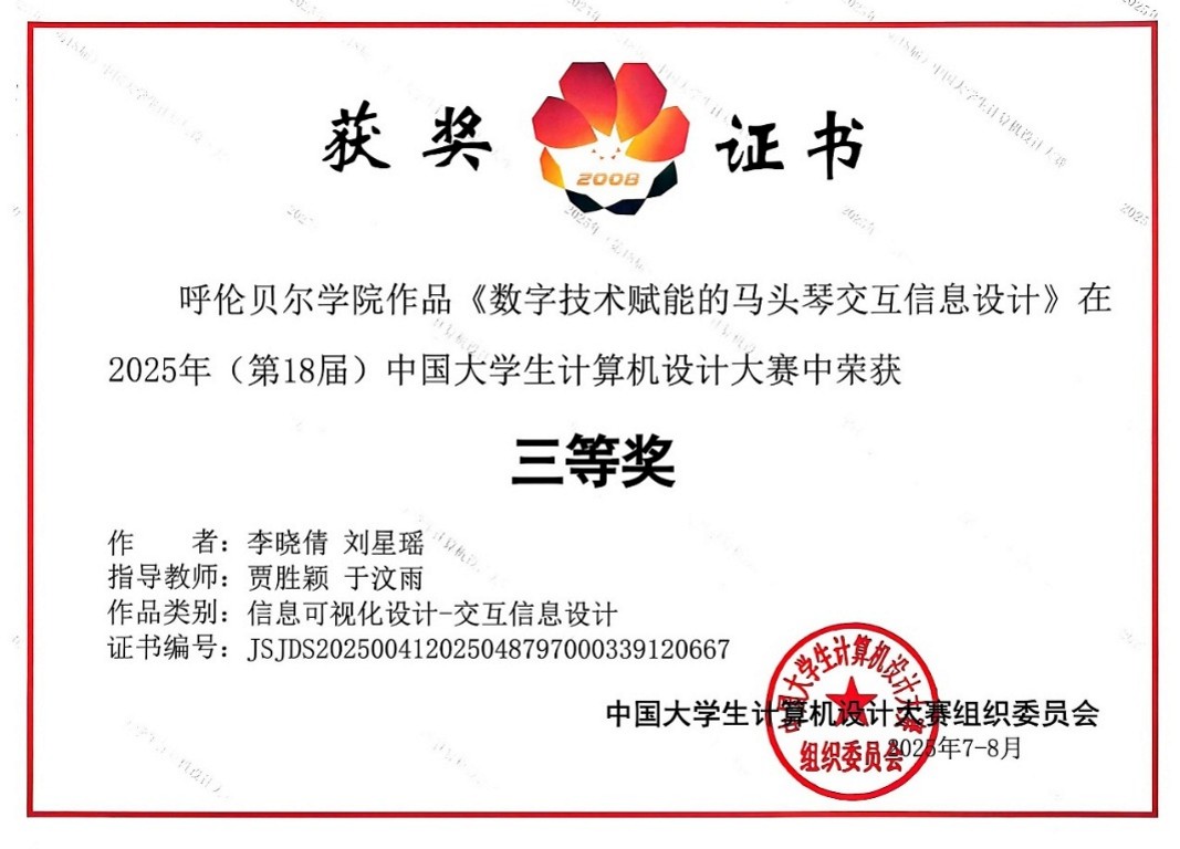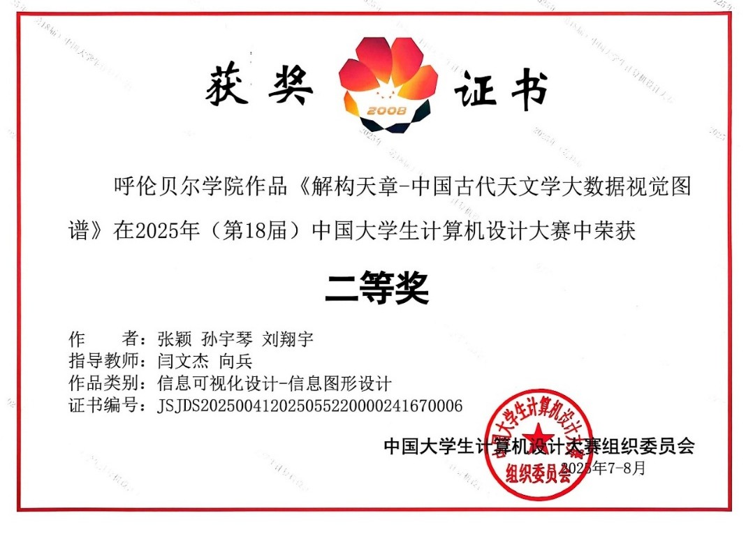 此次赛事中,世界杯官网学子的优异表现离不开师生团队的协同攻坚。自赛事启动以来,由张颖、孙宇琴、刘翔宇等同学组成的参赛团队,在指导教师的全程悉心指导下,投入大量时间与精力打磨作品。从最初的选题构思到后续的方案完善,师生们反复推敲作品的框架与细节;为了达到最佳呈现效果,团队成员对每一个技术环节、每一段演示内容都精益求精,历经数轮修改优化。最终,凭借这份执着与努力,作品《解构天章—中国古代天文学大数据视觉图谱》《数字技术赋能的马头琴交互信息设计》分别荣获信息可视化设计类二等奖、三等奖。
