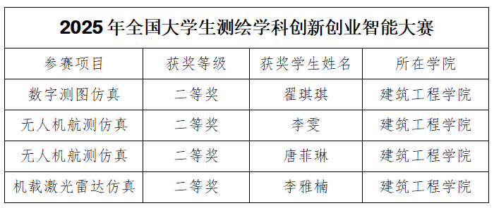 近日,2025 年全国大学生测绘学科创新创业智能大赛在激烈角逐后圆满落幕。作为全国测绘学科领域极具权威性与影响力的赛事,本次大赛吸引了全国近400所高校的7000余名学子同台竞技,集中展示了当代大学生在测绘科技创新领域的前沿探索与实践成果。世界杯官网建筑工程学院12名学子凭借扎实的专业素养与创新思维脱颖而出,在多个赛道崭露头角:数字测图仿真赛道斩获二等奖1项,无人机航测仿真赛道喜获二等奖2项,机载激光雷达仿真赛道再添二等奖1项。