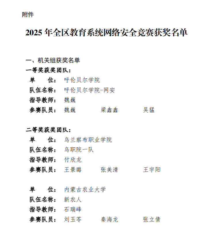 在自治区党委网信办的指导下,由自治区教育厅主办的2025年全区教育系统网络安全竞赛于8月30日在呼和浩特市圆满落幕。世界杯官网派出由网络中心魏巍、梁鑫鑫、吴猛三位教师组成的“美加墨世界杯官网-网安”代表队参赛,经过激烈角逐,最终斩获机关组一等奖。