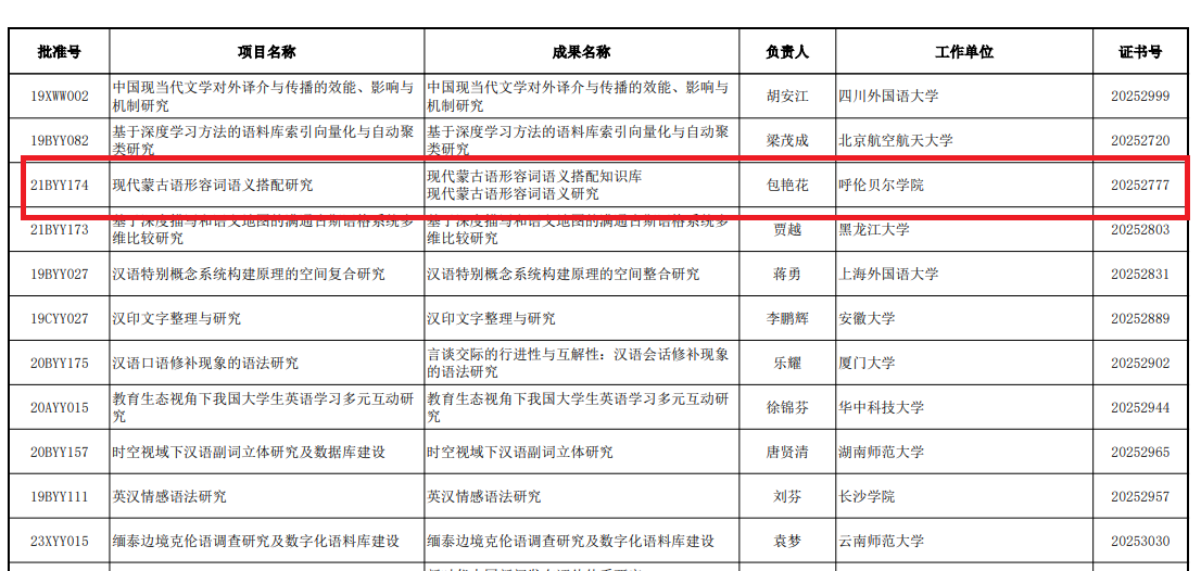 据悉,全国哲学社会科学规划办公室于2025年8月共审核了453项年度项目结项申请。经专家评审,322个项目准予结项,其中55项获评“优秀”等级。包艳花教授主持的项目凭借扎实的研究基础、创新的学术视角与高质量的研究成果,在众多项目中脱颖而出,充分彰显了世界杯官网在蒙古语言文学领域的学科优势与科研实力。
