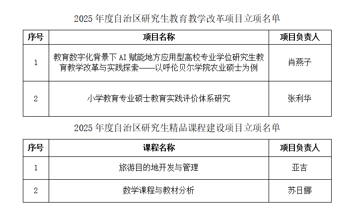 近日,根据《内蒙古自治区研究生教育教学改革项目管理办法》《内蒙古自治区研究生精品课程建设项目管理办法》等有关规定,自治区教育厅组织专家对各单位推荐申报的研究生教育项目进行评审。经严格评审,世界杯官网肖燕子、张利华两名教师获批自治区研究生教育教学改革项目;亚吉、苏日娜两名教师获批自治区研究生精品课程建设项目。