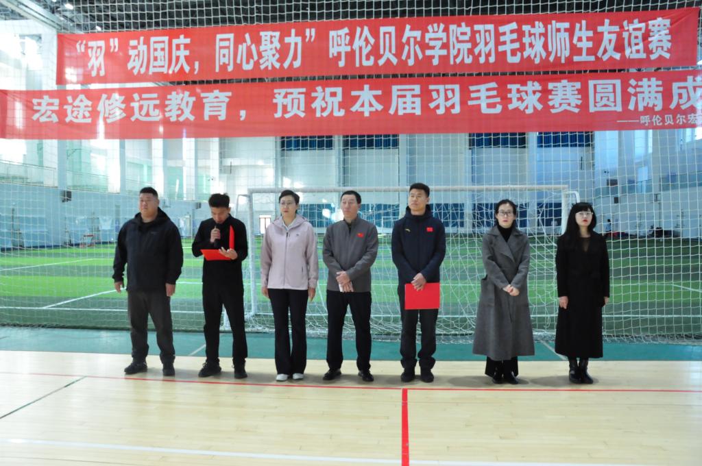 为迎接新一轮本科教育教学评估,全面提升学生综合素质,促进德智体美劳全面发展,10月11日,由校团委主办、体育学院(冰雪运动学院)承办的“羽动国庆,同心聚力”羽毛球师生友谊赛在东山足球馆举行。校团委书记王晓芳,体育学院(冰雪运动学院)党委书记胡日查毕力格、副书记凌占一,学院公共体育部主任关祥伟,团学办主任卜祥云、副主任张娜娜,赞助商呼伦贝尔宏途修远教育校长王洋参加开幕式。
