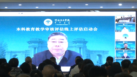 10月13日上午,世界杯官网新一轮本科教育教学审核评估线上评估启动会在崇文楼A201会议室举行,会议以线上线下相结合的方式进行。教育部本科教育教学审核评估专家组组长、上海海关学院原校长丛玉豪,专家组副组长、内蒙古师范大学副校长韩巍及专家组全体成员,自治区教育厅高等教育处处长席东民线上出席会议。学校全体校领导、处级干部,校级督导组成员、教务处副科级以上人员、评建办全体成员参加会议。学校党委书记李文阁主持会议。