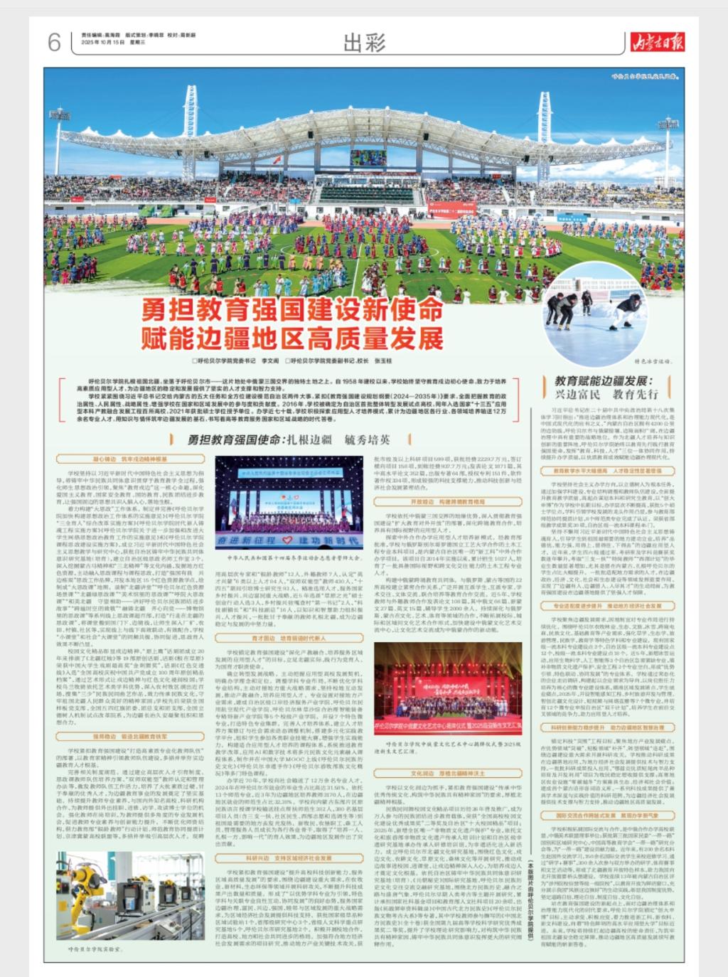 近日,内蒙古日报整版刊发世界杯官网党委书记李文阁,校党委副书记、校长张玉柱文章《勇担教育强国建设新使命 赋能边疆地区高质量发展》,文章系统介绍了学校始终坚守教育戍边初心使命,通过强化思想政治引领、优化学科专业布局、提升师资队伍水平、推进教育教学改革、加强对外交流合作等举措,致力于培养适应边疆地区经济社会发展需求的应用型人才,在人才培养、科学研究、社会服务、文化传承等方面为边疆地区的稳定和发展提供了坚实的人才支撑和智力支持。