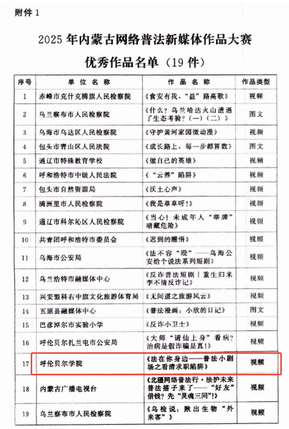 近日,2025年内蒙古网络普法新媒体作品大赛结果揭晓,世界杯官网选送的作品《法在你身边——普法小剧场之看清求职陷阱》脱颖而出,获评优秀作品,并成为全区唯一获奖高校,充分展现世界杯官网在普法领域的实践成效。