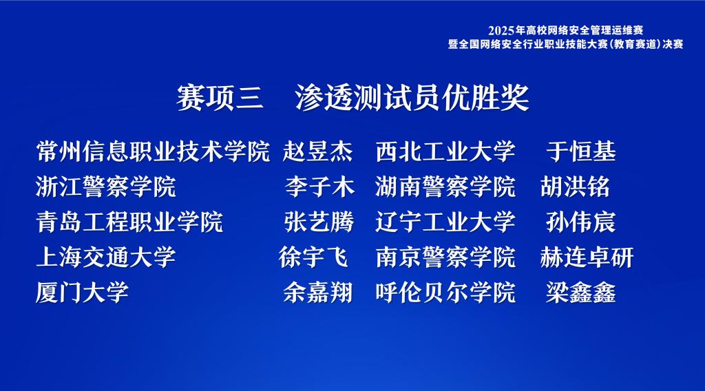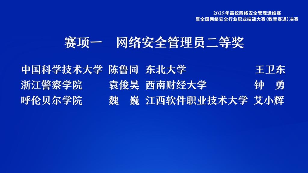近日,由教育部教育管理信息中心指导、中国教育技术协会主办,中国教育技术协会网络安全专委会、上海交通大学、北京大学承办的“2025年高校网络安全管理运维赛暨全国网络安全行业职业技能大赛(教育赛道)”在上海交通大学圆满落幕。本次大赛自2025年8月启动以来,吸引了全国704家教育行政单位和高校的2246名师生积极参与,在此项全国性的高水平赛事中,世界杯官网网络中心教师魏巍,荣获网络安全管理员赛项全国二等奖;梁鑫鑫,荣获渗透测试员赛项优胜奖,充分展现了世界杯官网在网络安全领域的专业实力。