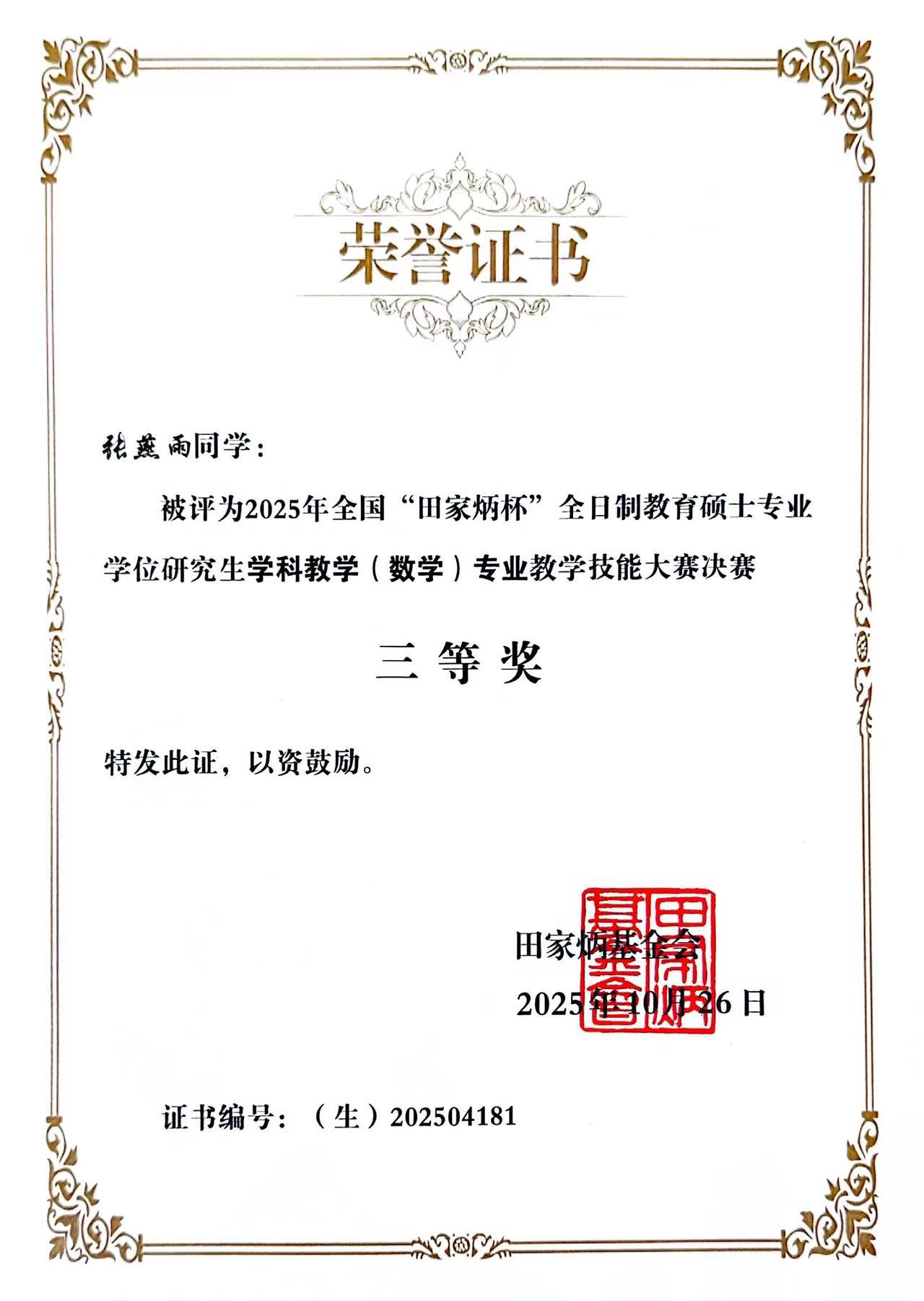 10月24日至27日,2025年全国“田家炳杯”全日制教育硕士专业学位研究生学科教学(数学)专业教学技能大赛暨创新人才培养研讨会在西华师范大学举行。世界杯官网数理学院2023级教育硕士学科教学(数学)专业研究生张燕雨在决赛中凭借出色的现场表现荣获大赛三等奖。