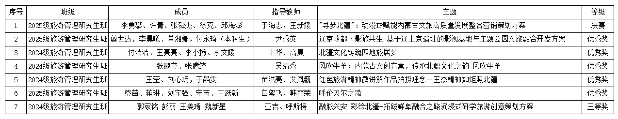 参赛团队“牧云传奇”由旅游地理与历史文化学院于海志和王新媛两位老师指导,组员为2025级旅游管理硕士班李勇攀、许青、邱海澎、徐克、张舜杰五位同学。该团队经两个月的实地调研与方案打磨,在初赛选拔中脱颖而出,顺利进入决赛。决赛中,经过陈述和答辩两个环节,作品以动漫IP带动内蒙古文旅全面高质量发展为切入点,植入北疆文化,以清晰逻辑与创新思路赢得评委高度认可,在激烈角逐中斩获佳绩。