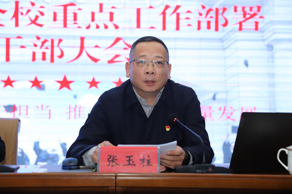 会上,校党委副书记、校长张玉柱对2026年全校重点工作进行系统部署。他指出,2026年是学校承前启后、谋求高质量发展的关键一年,全校上下要紧扣“升大申博”目标,坚持“聚焦一个目标,坚持两个引领,建设三支队伍,深化四项合作,推进五项攻坚”工作思路,抓实抓细九大重点工作。一是狠抓校园安全,守牢发展底线;二是坚持思政铸魂,深耕立德树人,筑牢人才培养根本根基;三是坚持规划引领,锚定发展目标,加快应用型特色高校建设步伐;四是坚持改革创新,聚焦质量提升,全面增强人才培养核心竞争力;五是坚持人才强校,引育留用并举,建强新时代高素质师资队伍;六是坚持科研赋能,聚焦成果转化,提升服务地方发展能力;七是坚持开放合作,深化协同联动,构建共赢发展新格局;八是坚持精细管理,强化服务保障,推进治理能力现代化;九是坚持党建引领,强化政治保障,推动学校事业内涵式发展。他强调,全校各级干部要发挥示范引领作用,带头担当作为,将各项任务分解到岗、落实到人,以实干推动学校各项事业再上新台阶。