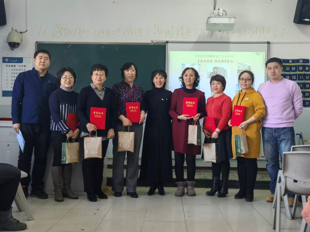 3月5日,外国语学院“孜孜不倦塑魂育人担重任 致敬百年巾帼奋进建新功”庆祝三八国际劳动妇女节暨2020年度“三八红旗手”颁奖典礼在外国语学院312教室隆重举行。活动由于涛老师、包东学老师主持。外院党总支书记金鑫鑫、院长吕佩臣、党总支副书记郑翠梅、副院长齐颖、副院长王国华出席了活动。外国语学院全体教职工参加了此次活动。