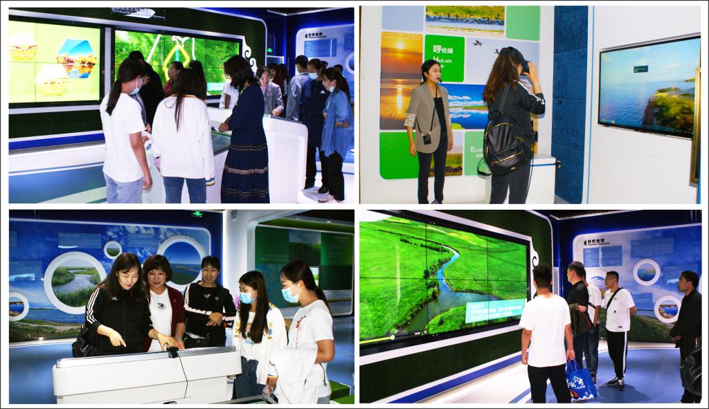 呼伦湖国家级自然保护区宣教大厅面积940平方米。宣讲员带领全体党员穿过模拟呼伦湖畔而建的数字化长廊,在“发展之道”的区域配合着呼伦湖国家级自然保护区的实时监测画面为大家详细的讲解了呼伦湖的形成和演变、保护区内的珍惜动植物和呼伦湖脆弱的水环境等内容。