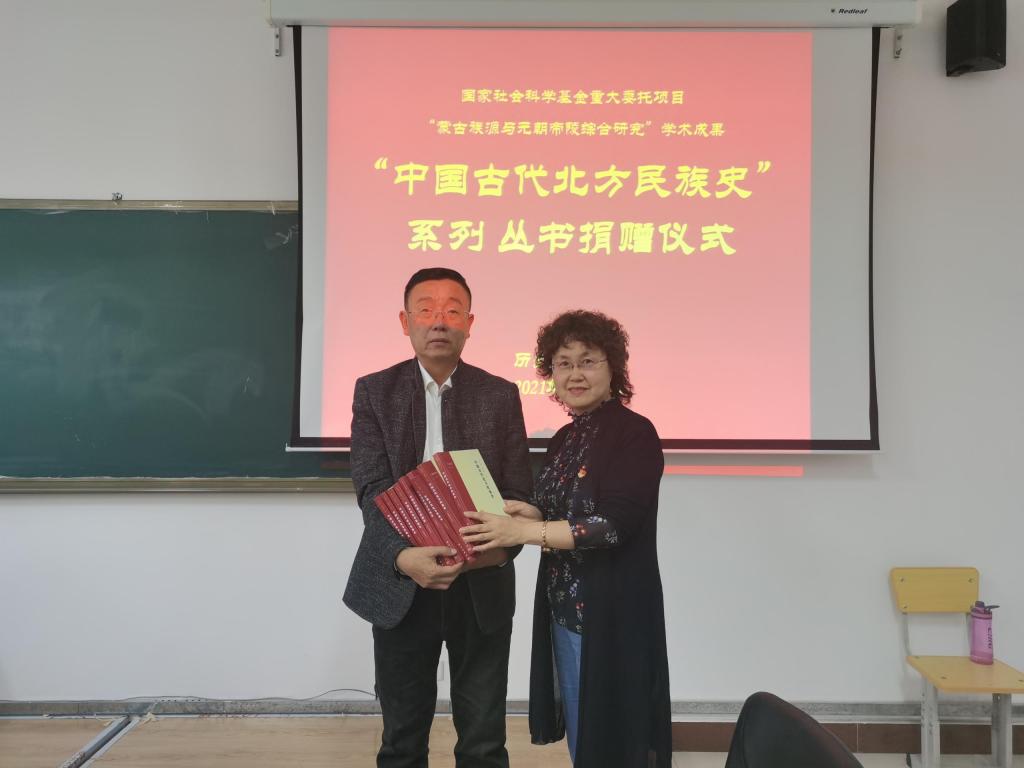 为庆祝中国共产党建党100周年、铸牢中华民族共同体意识、推动学院教科研工作,9月15日,历史文化学院党总支书记梁云教授向历史文化学院赠送她参与编写的《中国古代北方民族史》丛书。该丛书为国家社会科学基金重大委托项目“蒙古族源与元朝帝陵综合研究”子课题而开展研究、编写的十卷本丛书。赠书仪式由历史文化学院院长乌日图教授主持,学院领导与专任教师、行政人员参加。