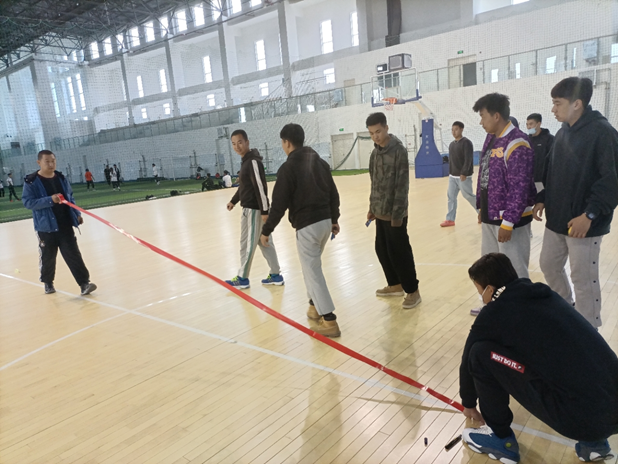 教师志愿者郭晨、张大伟、秦智勇等老师正在进行室内场馆贴线更换