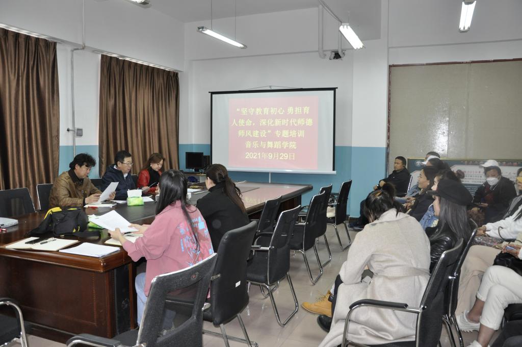 按照学校关于举办“坚守教育初心 勇担育人使命,深化新时代师德师风建设”专题网络培训的通知要求,9月29日下午,音乐与舞蹈学院组织全体教职工在艺术楼606会议室进行专题培训。音乐与舞蹈学院党总支书记李雅杰主持本次培训。