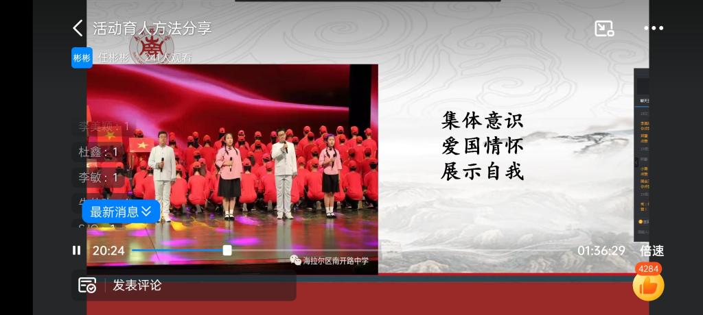 任彬彬老师通过丰富的班主任工作案例、活动图片、音视频等形式,分享了自己多年来担任班主任开展育人活动的经验。她详细介绍了怎样结合中学语文教学中活动育人的方法,在活动中树立中学生正确的世界观、人生观和价值观,让爱国主义精神在青少年心中牢牢扎根。