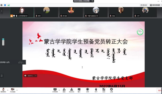 6月15日下午,蒙古学学院学生党支部召开预备党员转正大会。会议由学生党支部书记山丹主持,蒙古学学院党总支书记乌云、党总支副书记乌云图、入党培养介绍人和学生预备党员参加会议。