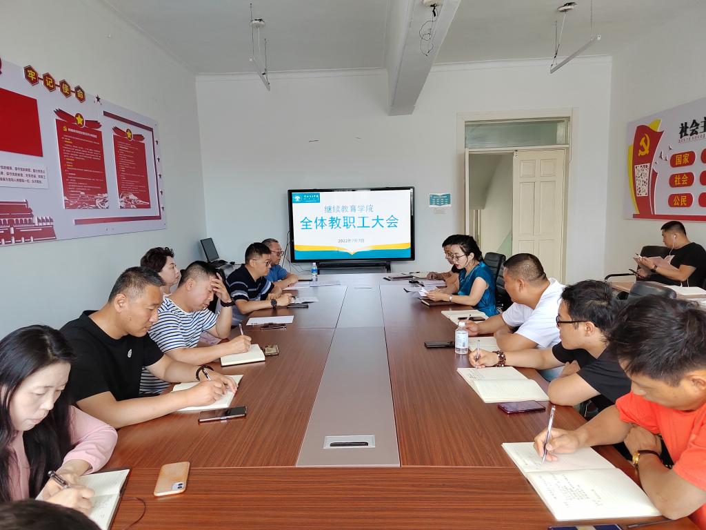 7月7日下午,继续教育学院召开全体教职工2022年暑期工作安排及下学期开学前准备工作部署会,会议由继续教育学院院长莎茹莉主持,全体教职工参加。
