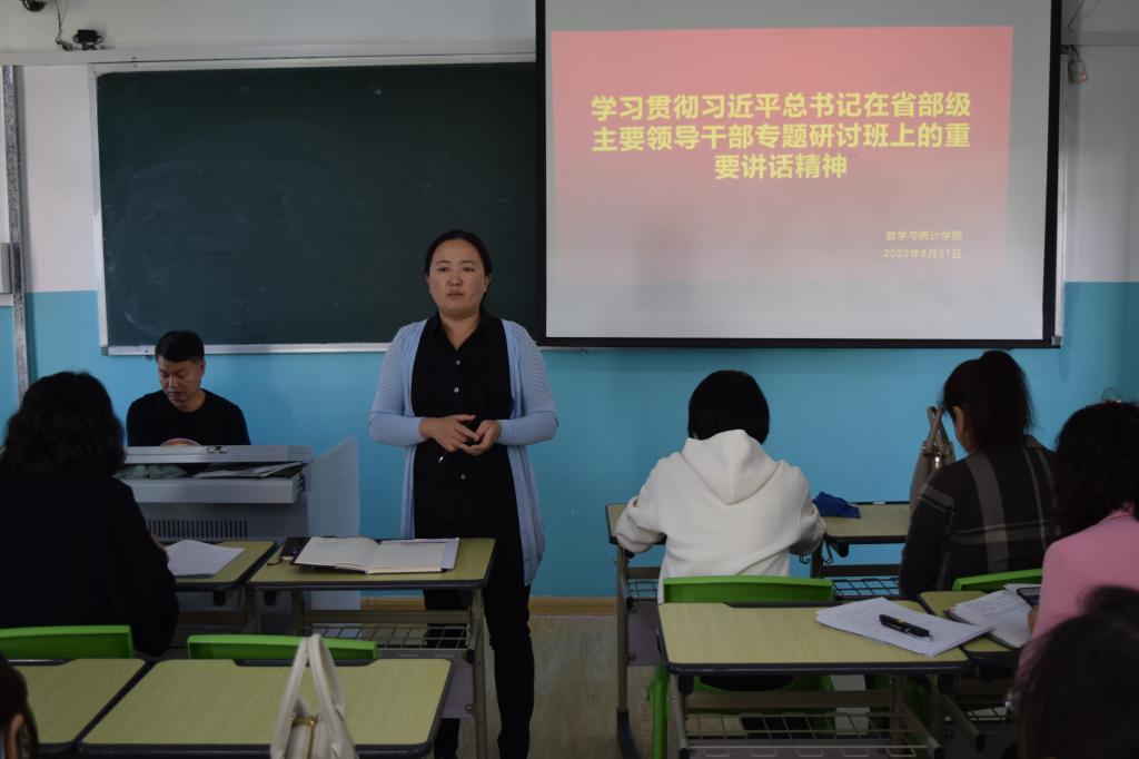 8月31日下午,数学与统计学院召开全体教职工会议,传达学习贯彻习近平总书记在省部级主要领导干部专题研讨班上的重要讲话精神。党总支书记宋旭霞主持会议。