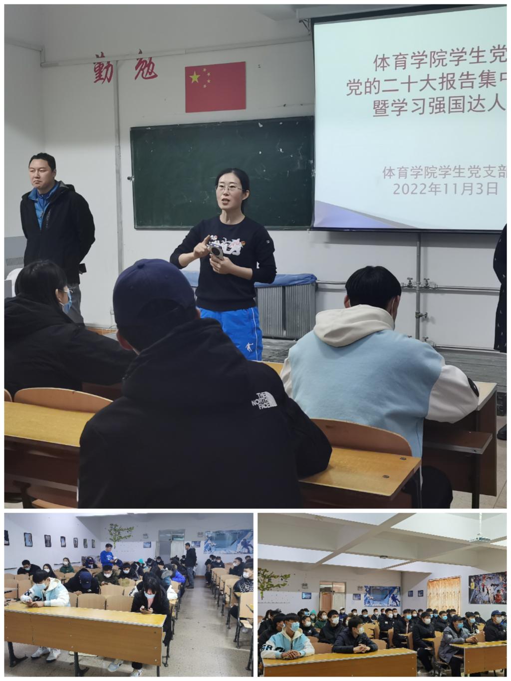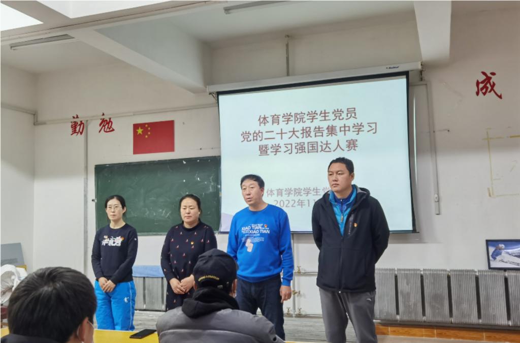 为深入学习宣传贯彻党的二十大精神,进一步加强学生党员理论学习,提高全体学生党员政治理论素养,11月3日上午,体育学院学生党支部在体育馆二楼多媒体教室开展了“学习二十大永远跟党走奋进新时代”为主题的学生党员集中学习党的二十大报告活动暨“学习强国”达人赛。活动由学生党支部书记卜祥云主持,学院党总支书记李伟艳,副书记胡日查,社会体育指导与管理系系主任李嘉麟,学院大三、大四两个年级共45名学生党员参加了此次活动。