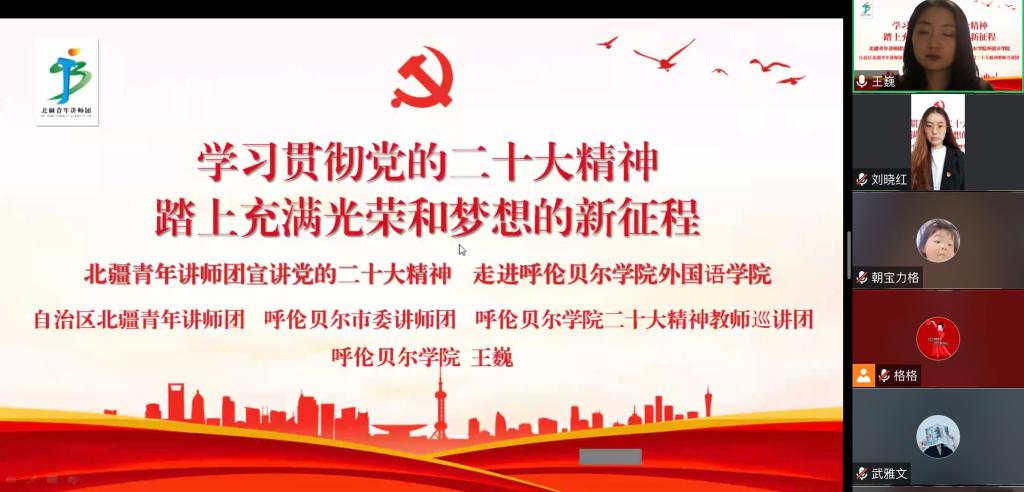 为全面深入学习贯彻党的二十大精神,12月8日,外国语学院党总支在线上开展党的二十大精神宣讲活动,活动邀请美加墨世界杯官网学习贯彻党的二十大精神校园巡讲团成员、外国语学院团学办公室副主任王巍为学院师生宣讲党的二十大精神。学院领导班子成员、全体教职工、全体学生党员及青马班成员等150余人参加。活动由学院党总支书记金鑫鑫主持。